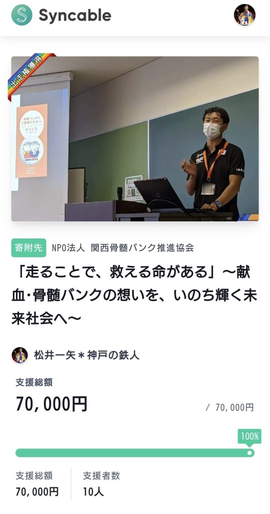 その使命を全うしていきます。ドネーションは、これで終わりではなく、むしろ、ここからが始まりです。チャリティーランナーとして、新しい自主企画も立ち上げ、より一層の寄付金の呼び掛けに努めていきます。